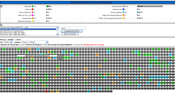 La licencia incluye la posibilidad de visualizar la totalidad de las sucursales de cliente representadas en círculos identificados por región (números romanos. Los colores significan el estado actual en que se encuentran